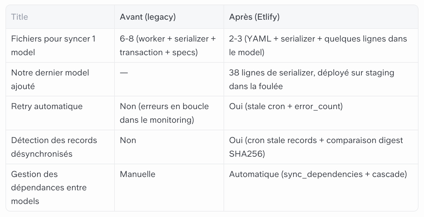 └── Serializer#to_h → Adapter#upsert! → :syncedLe worker, l’adapter et le synchronizer sont partagés entre tous les models. Vous n’écrivez que ce qui est spécifique : le serializer et la config.