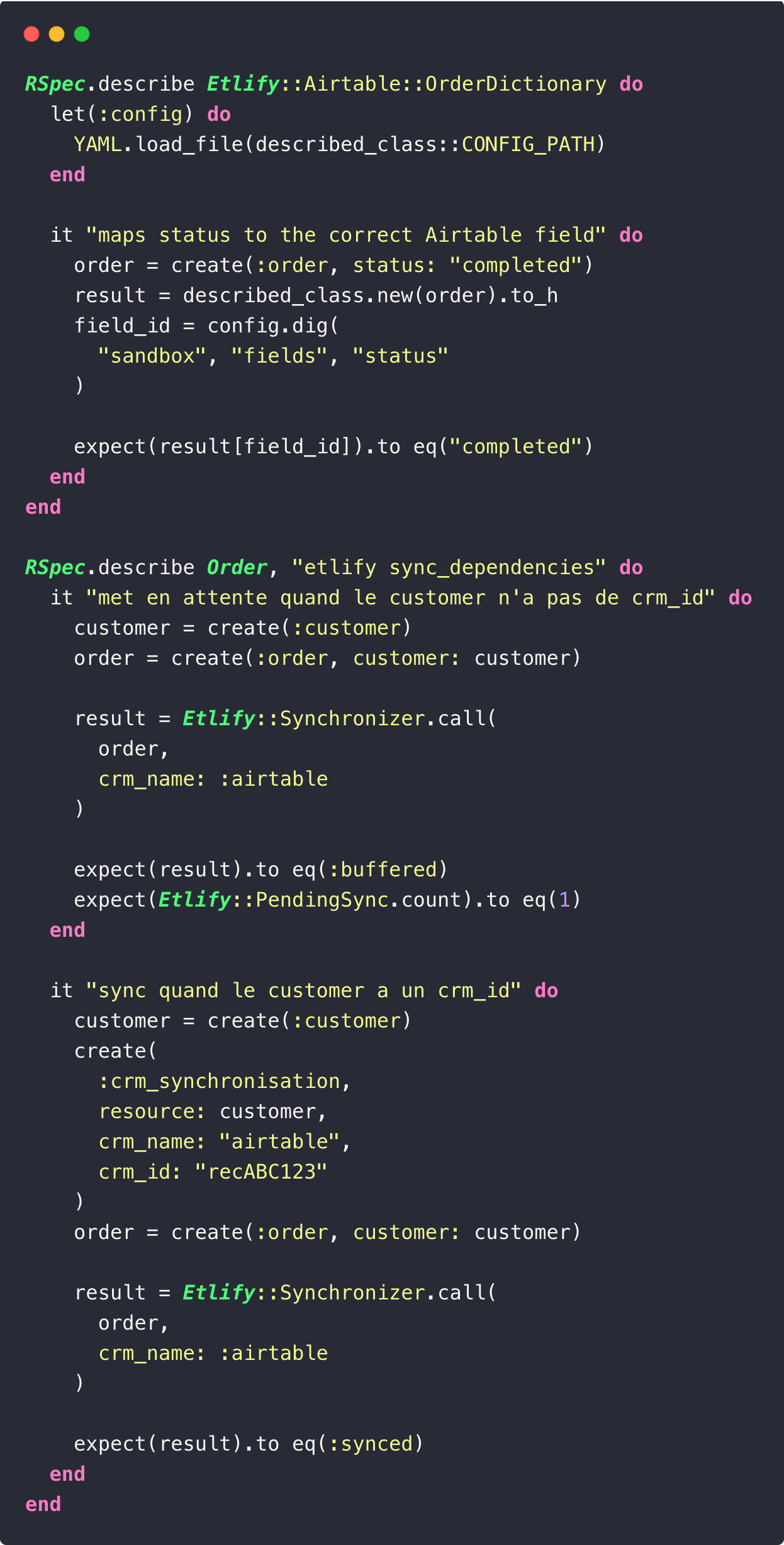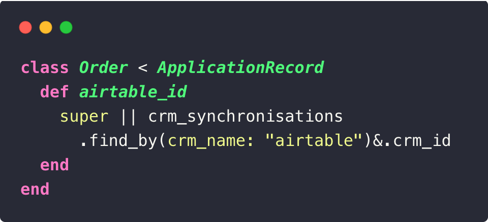 Tout est en place. Pour synchroniser un record : order.crm_sync!(crm_name: :airtable). Un one-liner depuis vos services, transactions ou controllers. Nous l’appelons après un paiement validé, dans nos transactions de membership, dans les services d’onboarding. Le synchronizer gère le reste.