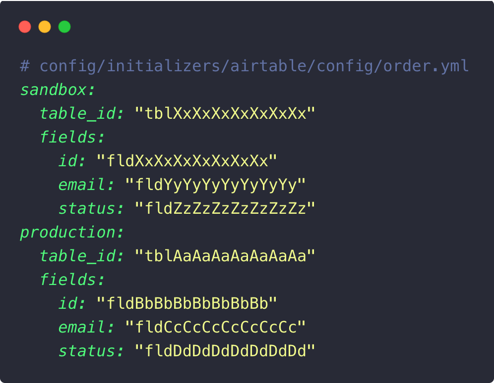 Chaque model a son fichier YAML. L’idée c’est de découpler vos noms de champs des IDs Airtable. Un champ renommé côté CRM ? Vous changez le YAML, pas le code.