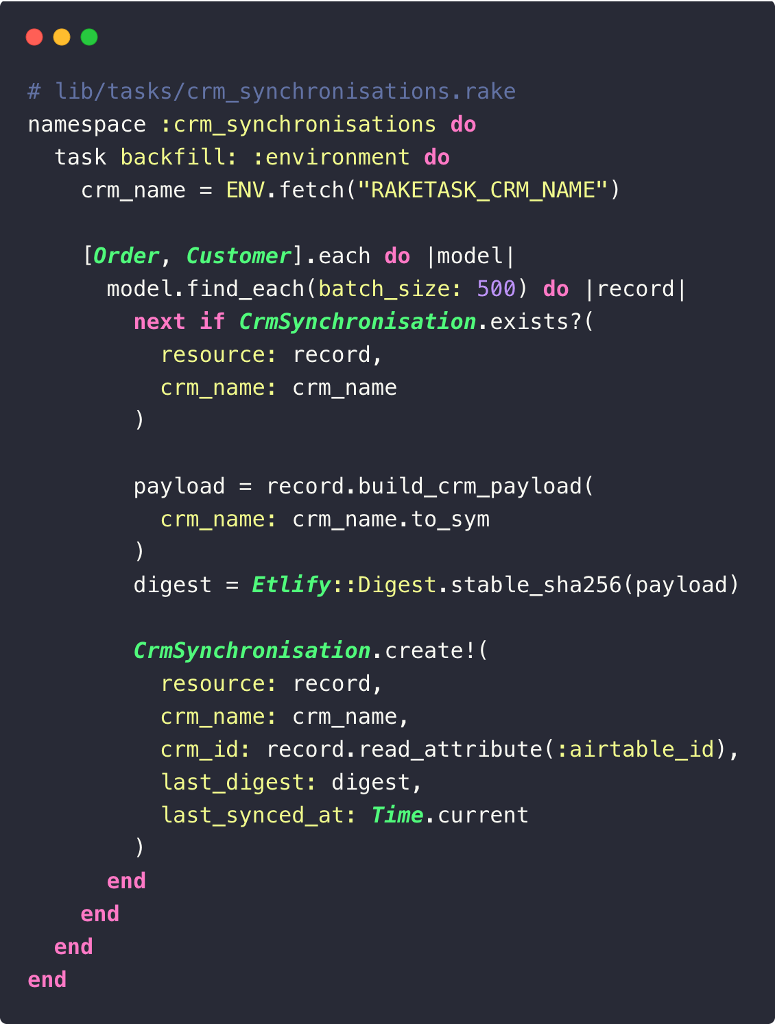 Pour éviter de re-sync tous vos records via l’API, un rake task crée les CrmSynchronisation en masse à partir des airtable_id existants :