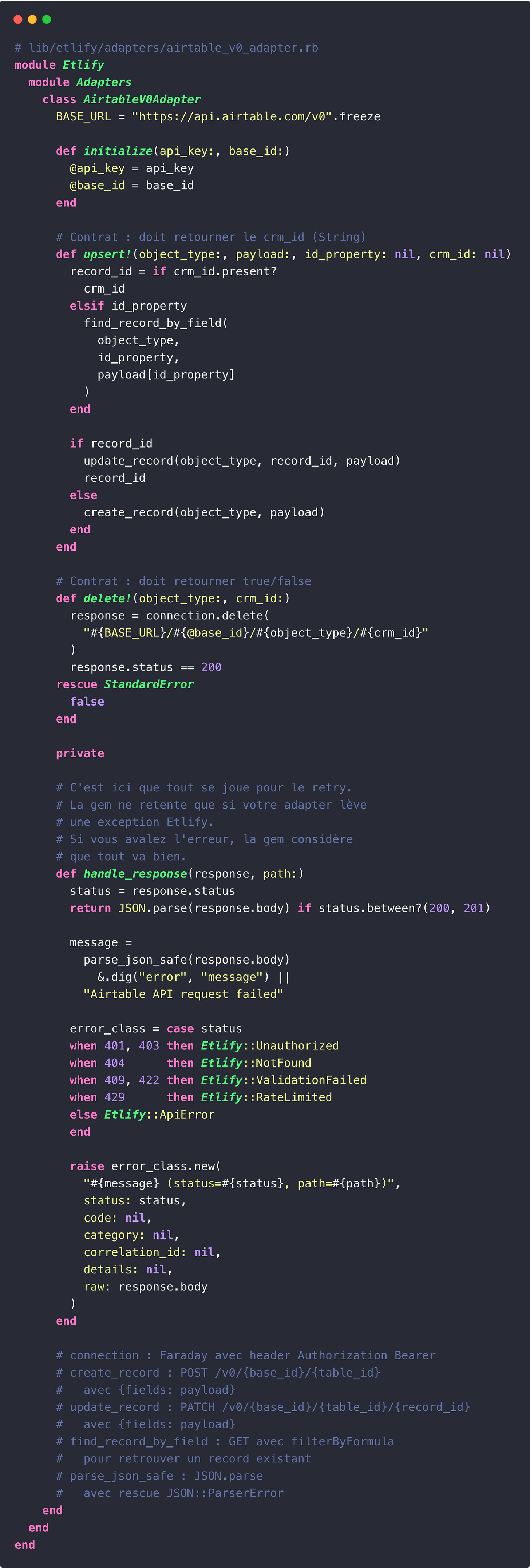 La gem fournit le contrat. L’adapter, c’est vous qui l’écrivez. Voici le nôtre pour Airtable :